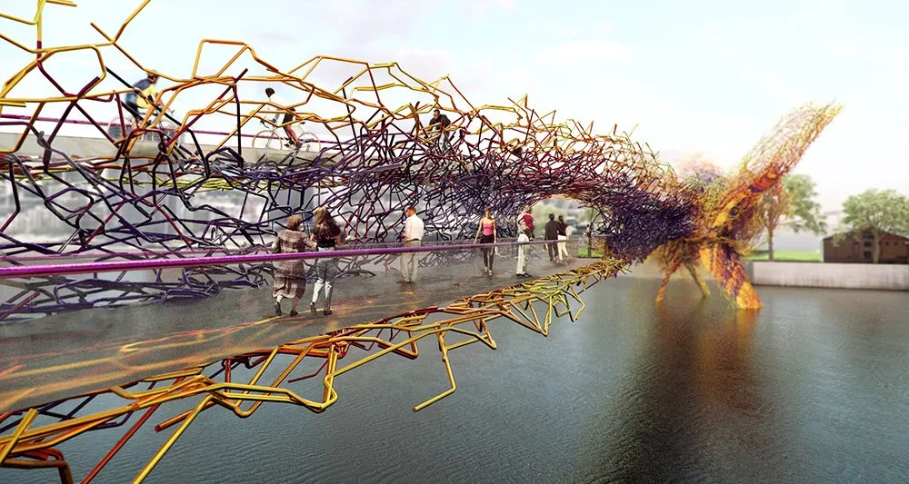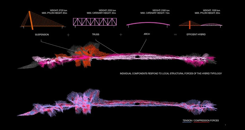 The bridge’s hybrid structure does not apply specific elements to structural roles (such as cable, mast, arch etc), instead these various structural roles operate through a cloud of components – a fuzzy hybrid. This blurred condition masks the structural logic and instead focuses attention on the experience of this immersive space.